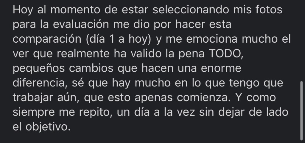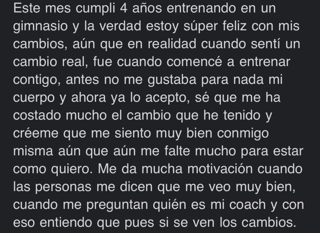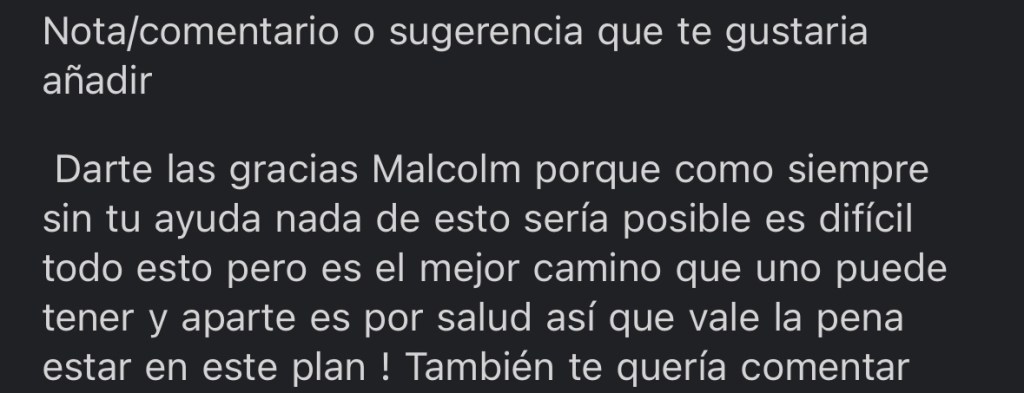 –Al realizar tu registro recibiras tu formulario inicial con +35 preguntas donde se busca abarcar todo absolutamente acerca de ti y tu dia a dia, para estructurar un programa con alimentos de tu gusto, horarios establecidos para comidas, tiempos sostenibles en tu entrenamiento, numero de comidas que SI puedas realizar y sobre todo buscando lograr tus objetivos y aprender a sobrellevar este estilo de vida